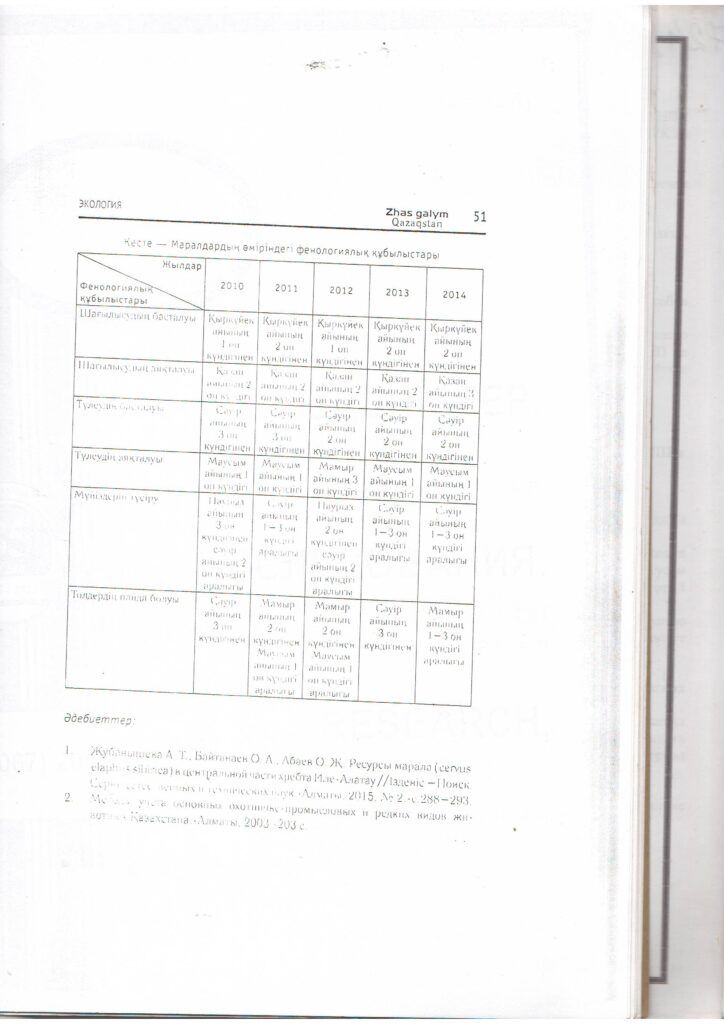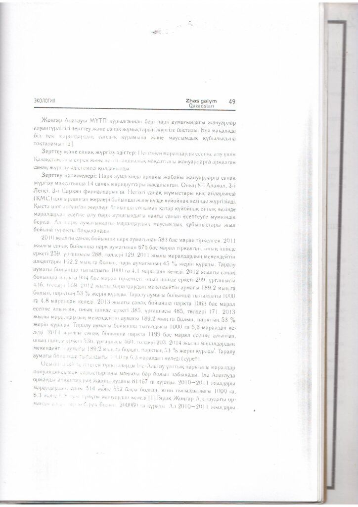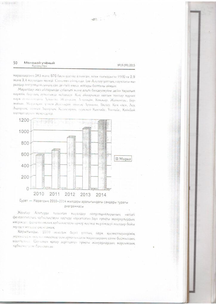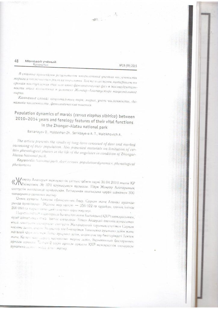 Жаңалықтар2010-2014 жылдардағы маралдар санының динамикасы (Cervus elaphus sibiricus) және Жоңғар-Алатауы ұлттық паркіндегі олардың тіршілік әрекетінің фенологиялық ерекшеліктері (2015 ж.)