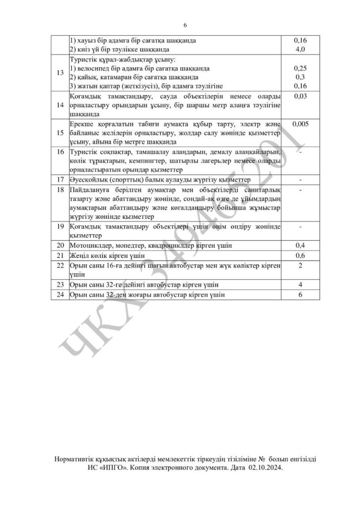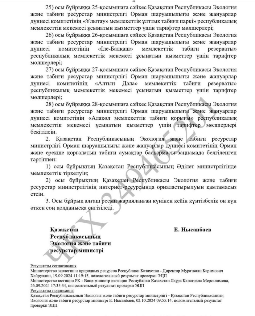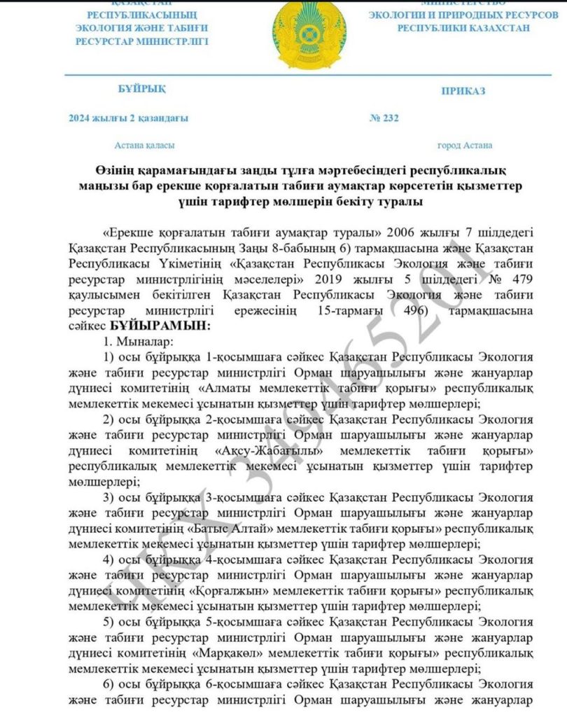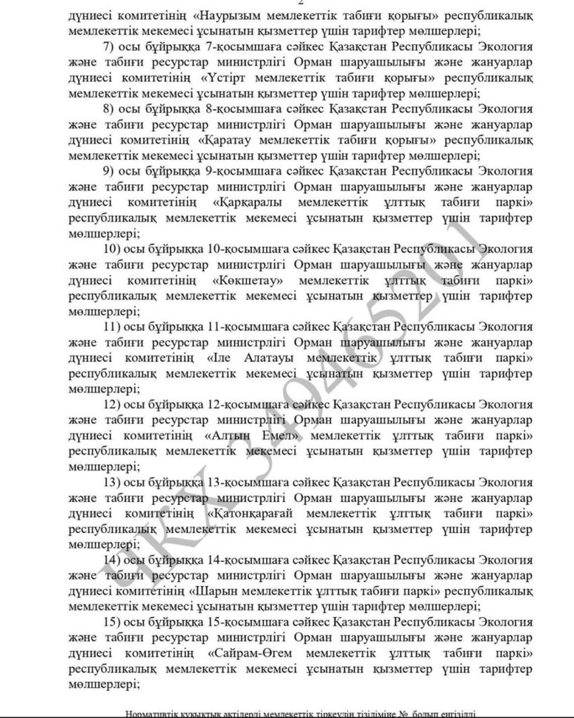 Республикалық маңызы бар ерекше қорғалатын табиғи аумақтар көрсететін қызметтердің жаңа тарифтері бекітілді