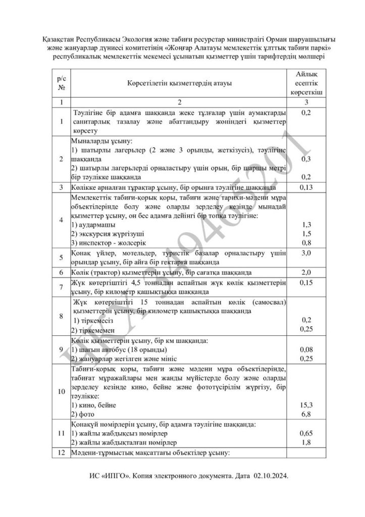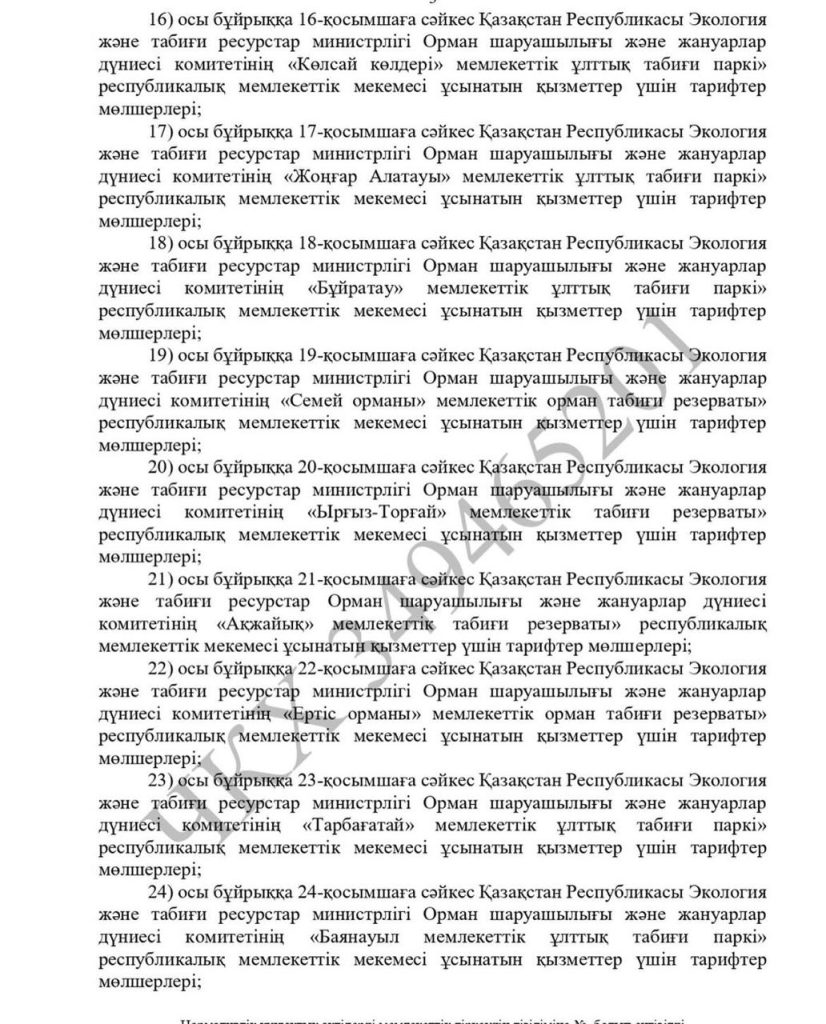 Жаңалықтар Республикалық маңызы бар ерекше қорғалатын табиғи аумақтар көрсететін қызметтердің жаңа тарифтері бекітілді