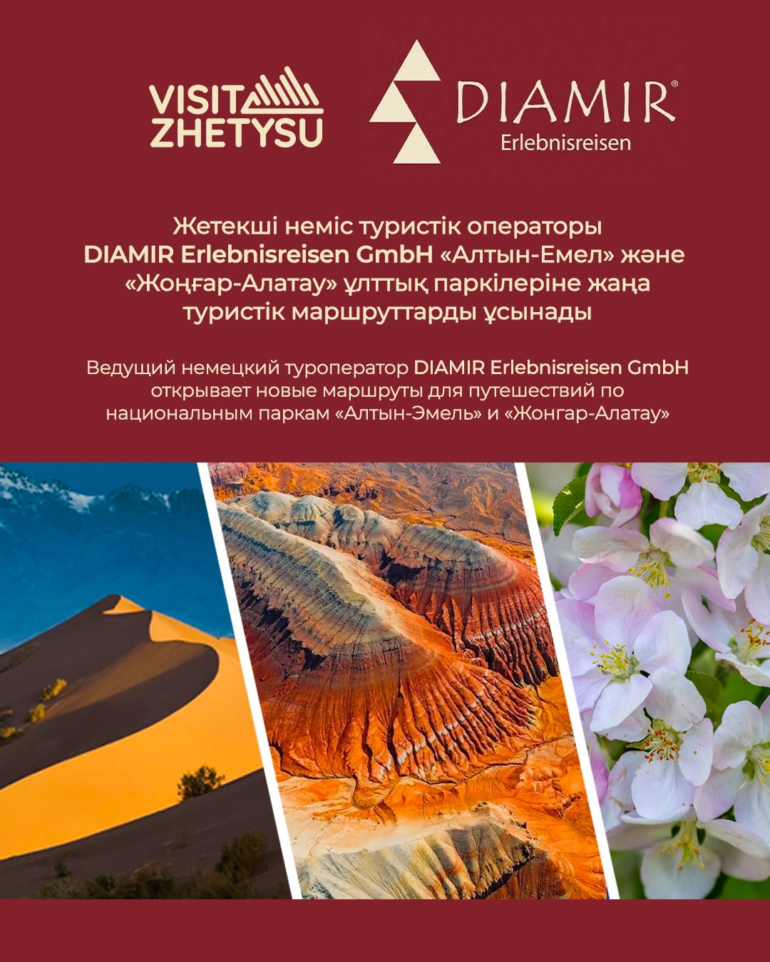 Біз Германияның жетекші туроператоры DIAMIR Erlebnisreisen компаниясымен ынтымақтастықтың басталғанын қуана хабарлаймыз. Бұл компания әлем бойынша эксклюзивті шытырман оқиғалы және экологиялық турларды ұйымдастыруда танылған сарапшы болып табылады. Енді олардың туристік бағыттары қатарында біздің өңір де маңызды орын алмақ.