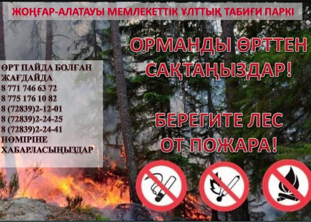 Что касается причин возгорания, то одна из них происходит по вине жителей, а девять — из-за удара молнии. Лица, виновные в нарушении правил пожарной безопасности в лесу, подлежат административной и уголовной ответственности. Согласно пункту 3 статьи 367 КоАП РК, граждане подлежат административному штрафу в размере 100 МРП (345 000 тенге) за нарушение мер пожарной безопасности в лесу. На обочинах дорог на территории лесного фонда установлены противопожарные аншлаги, ведутся работы по уходу за минеральными полосами, на территории парка и в приграничных к парку населенных пунктах ведутся работы, беседы с крестьянскими хозяйствами, раздаются предупреждающие листовки о соблюдении правил пожарной безопасности.